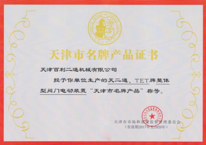 整體型閥門電動(dòng)裝置名牌產(chǎn)品證書