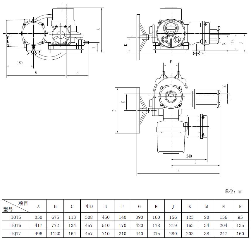 IQT系列智能型電動(dòng)執(zhí)行機(jī)構(gòu)是我公司最新研制的具有完全自主知識(shí)產(chǎn)權(quán)的新一代智能化控制產(chǎn)品。其采用超大規(guī)模的模擬和數(shù)字混合集成芯片進(jìn)行設(shè)計(jì),組成SOC系統(tǒng)。使得精確控制與高性能實(shí)現(xiàn)完美結(jié)合,其中設(shè)置的功能涵蓋了用戶對(duì)此執(zhí)行機(jī)構(gòu)的所有技術(shù)要求。IQT系列為部分回轉(zhuǎn)型,輸出轉(zhuǎn)矩范圍50N.m~12000N.m。